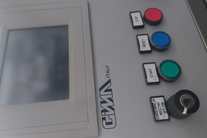 Stan techniczny: Maszyna używana, wizualnie w bardzo dobrym stanie. Polskie opisy na panelu oraz naklejki ostrzegawcze (np. "Uwaga! Nie zdejmuj osłon...") świadczą o tym, że sprzęt pracował do końca w krajowym zakładzie produkcyjnym.