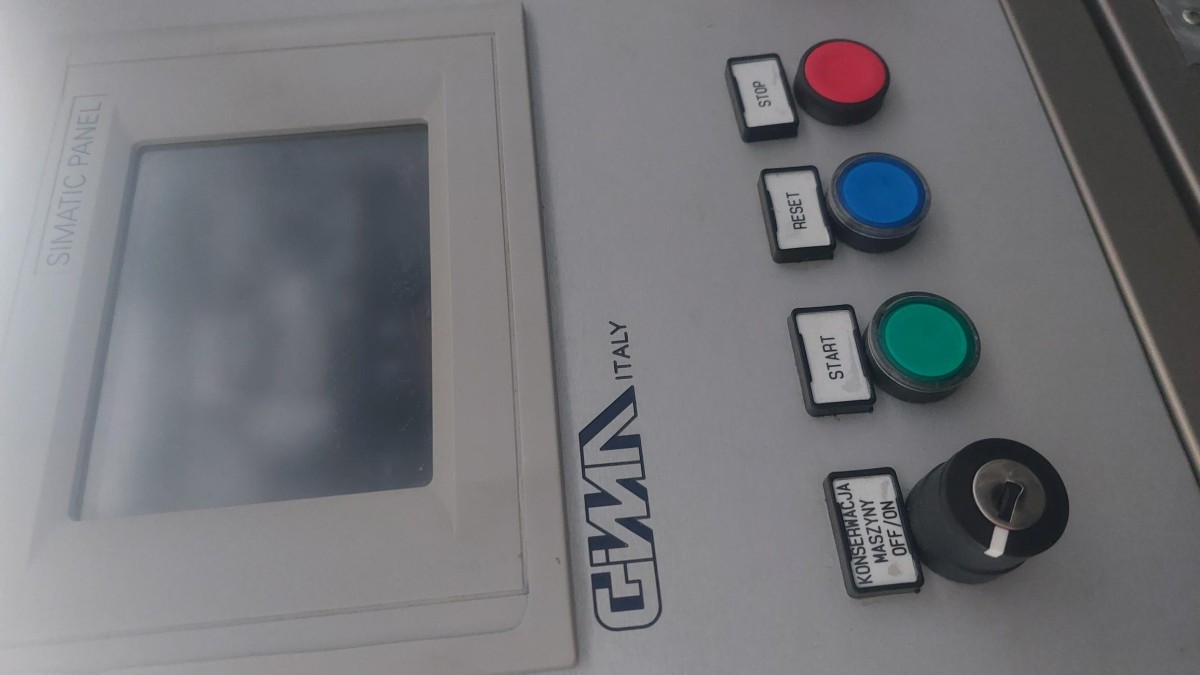 Sterowanie: Nowoczesny i niezawodny panel dotykowy HMI Siemens SIMATIC. Dodatkowo na pulpicie znajdują się fizyczne przyciski funkcyjne (Start, Stop, Reset) oraz stacyjka "Konserwacja Maszyny".
