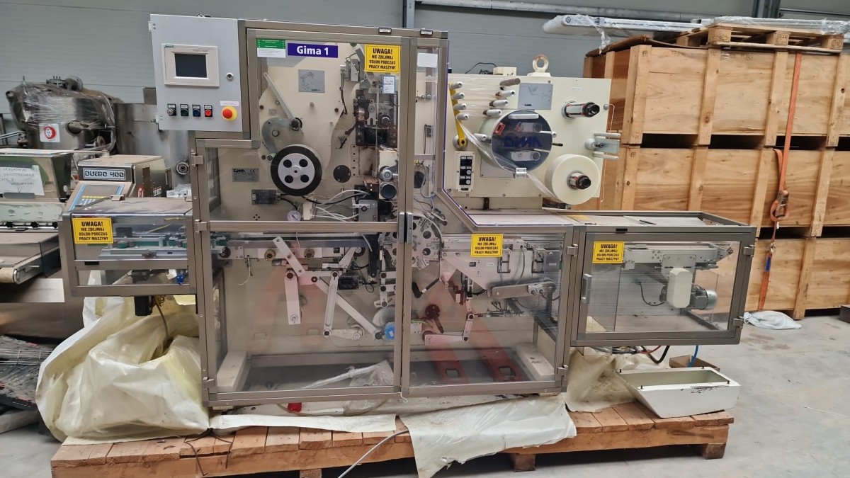 Posiadamy na sprzedaż profesjonalną maszynę pakującą (foliarkę kopertową / tzw. overwrapper) renomowanego włoskiego producenta G.I.M.A. S.p.A. (obecnie część międzynarodowej grupy IMA).