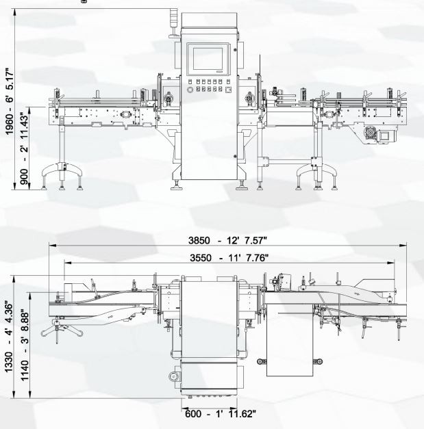 Pojemniki są transportowane pojedynczymi rzędami przez maszynę za pomocą taśmy przenośnikowej, która przecina całą maszynę.