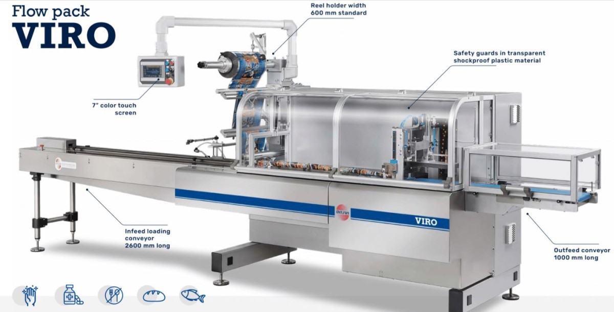 Maszyna pakująca pozioma typu "flow pack", która umożliwia uzyskanie opakowań uszczelnionych z trzech stron, wykonanych z elastycznego materiału opakowaniowego w rolkach.